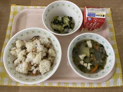 主食・主菜:秋鮭と舞茸の混ぜご飯 副菜:わかめときゅうりの酢の物 汁物:豚汁