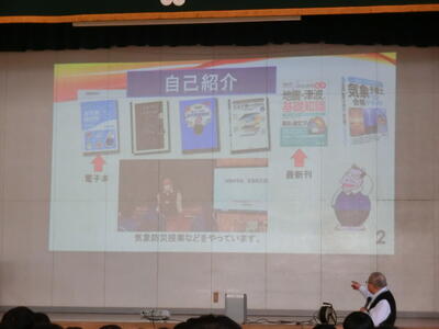 野田市のハザードマップや、避難情報、具体的な避難方法、雷と突風、竜巻の予想についてなど、「出前授業ならでは!」の内容でした。特に気象についての内容は2年生理科の授業でも取り扱うので、タイムリーな出前授業でしたね。防災安全課の皆様、ありがとうございました。