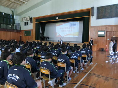 興奮冷めやらぬ中、生徒会執行部が給食委員、生活委員とコラボレーションして南部中の課題と対策についてプレゼンテーションをしてくれました。