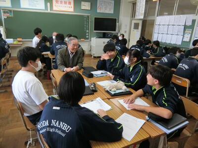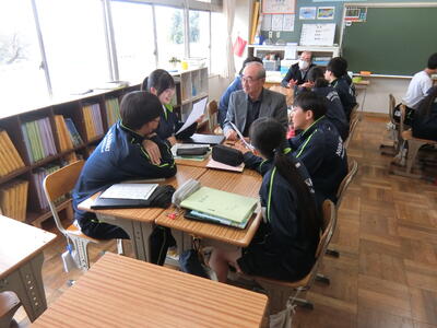 「お仕事はどんなことをしていましたか」、「今、幸せなことは何ですか」、「中学校時代の話を聞かせてください」など、質問をしている生徒の目はキラキラしていました。「笑い」も「真剣な雰囲気」もあり、大変有意義な授業になりました。