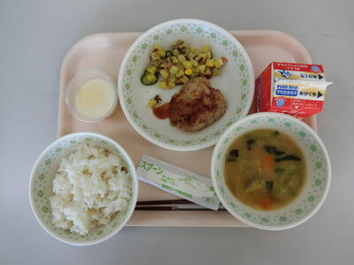 主食:ご飯 主菜:米ぬかと塩こうじのハンバーグ 副菜:甘酒ドレッシングサラダ 汁物:野田野菜の味噌汁 カレー風味 デザート:みそミルクプリン