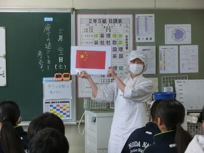 給食の時間に栄養士の実習生水野先生が献立についてのクイズをしました。