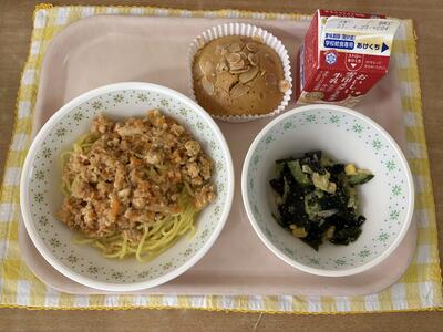 今日の給食は「ジャージャー麺」「黒糖とアーモンドの蒸しパン」「海藻サラダ」でした。ジャージャー麺にはにんじんが入っていました。このにんじんは、千葉県産で今が旬です。おいしくいただきました。