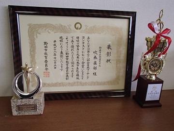 (教育委員会の表彰状、記念の盾〈左〉、M協関東大会金賞のトロフィー〈右〉)
