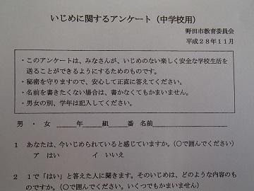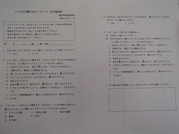 本日、全校一斉に「いじめに関するアンケート」を実施しました。今の南部中は、生徒の自治活動が展開され、落ち着いた教育環境で生徒と教職員が学校生活を送っています。しかし、些細な事がいじめ等に発展することは、珍しくありません。野田市では、小さなことを見逃さず、早期発見、早期対応を展開するための方策の一つとして、「アンケート」を実施しています。この他、南部中では、生活記録ノート(総称)を活用して、子どもの声を学級担任が拾っています。また、教職員の連携がよく、多くの教職員の目で生徒を見守っています。