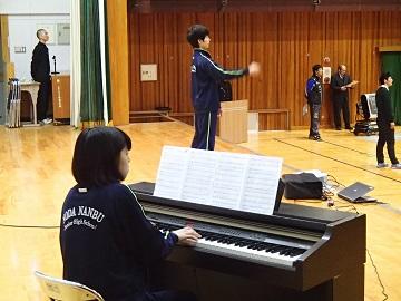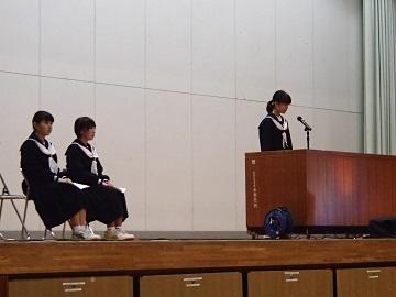 1年生の妹川さんは、より高いものを目指す、いじめをなくす五箇条について、2年生の森永さんは、スキースクールへの取り組み、南部中学校の顔として、3年生の宮本さんは、多くの行事を通して成長したこと、進路開拓に向けて、学年が一丸となることについて発表しました。