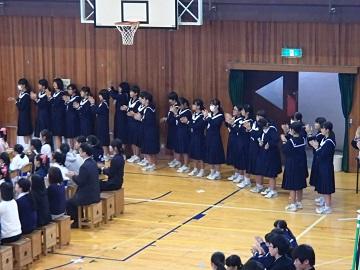 (体育館後方では、吹奏楽部の演奏に手拍子を送り、演奏を盛り上げました。反対側では、男子生徒も手拍子で盛り上げました。)