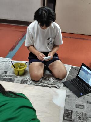 放課後、一階の廊下の隅で美術部員が関宿フェスティバルに向けて、看板(?)作りをしていました。