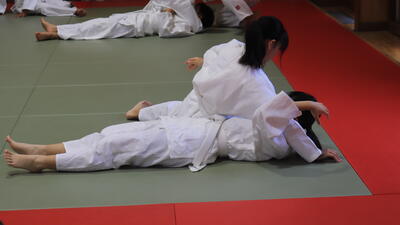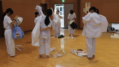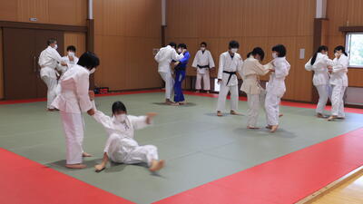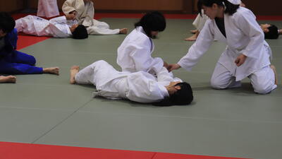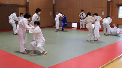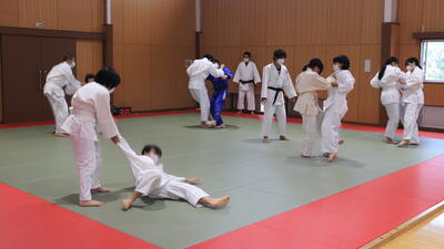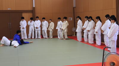 格技場では1年生が柔道の学習をしていました。柔道着を着ると、また違った印象です。今日は袈裟固めの練習でした。