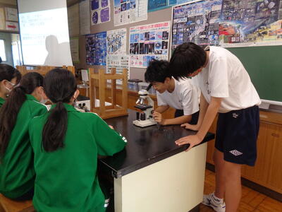 2年生は、顕微鏡を使って微生物の観察をしていました。学校の池の水を調べています。「何かいる~」という声が聞こえてきましたが、何を見つけたのでしょう?