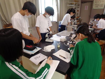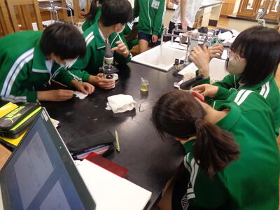 2年生は、顕微鏡を使って微生物の観察をしていました。学校の池の水を調べています。「何かいる~」という声が聞こえてきましたが、何を見つけたのでしょう?