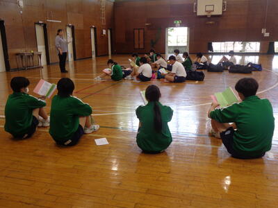 本日は、生活委員会が中心となって「挨拶って何だろう?」と全校生徒で考える時間がありました。先日の生徒総会で「声々堂々」というスローガンがきまりました。これをもとに、生活委員会が考えた企画です。自分の考えやグループで話し合った結果をまとめて、「相手への敬い」「相手も自分も元気になる」「相手とつながるステップ」など、いろいろな意見が出されました。数日前には、1年生3人が朝の登校時間中に校門に立って、自主的に「挨拶運動」をしていました。校門前を通る小学生も、笑顔で手を振って挨拶するなど、心温まる光景でした。挨拶の輪がさらに広まるといいですね。