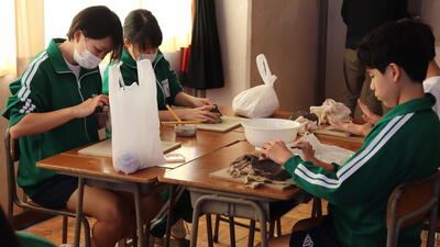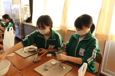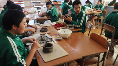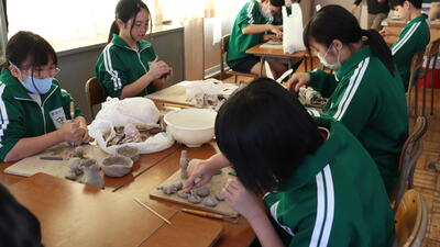 美術室では、1年生が思い思いに粘土をこねて、作品を作っていました。