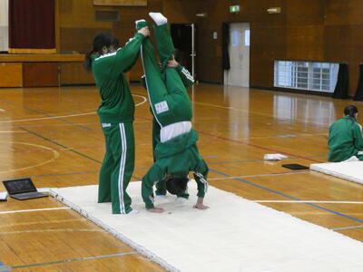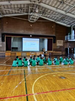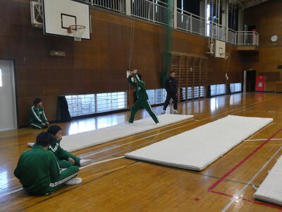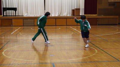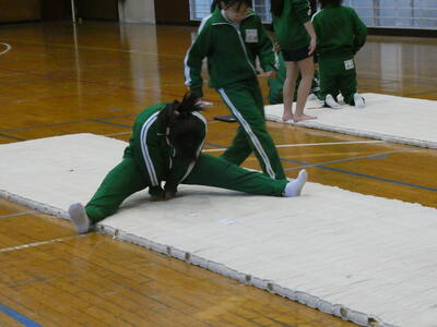体育館では、あおぞら学級が体育で体づくり運動をしていました。床が滑って大変そうでした。