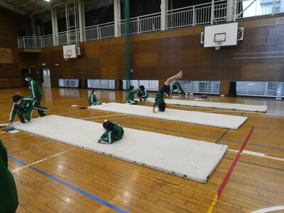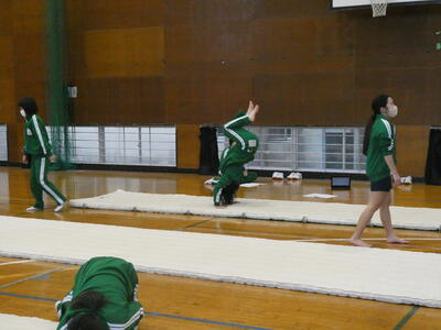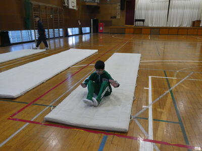 別の時間には、1年生が賑やかに、マット運動をしていました。