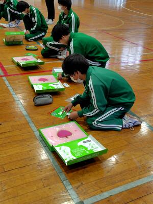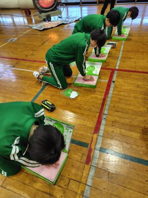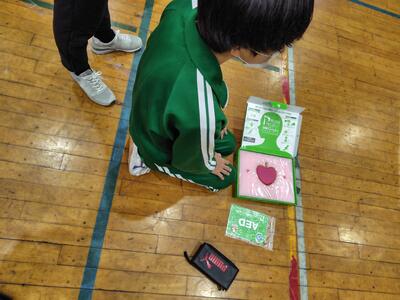 本日2年生は、野田市消防本部の方をお招きして、応急手当講習会を行い、AEDの使い方などを学びました。関宿中学校は、職員玄関にAEDを置いています。