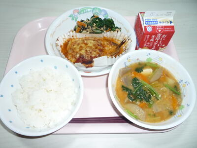 献立: 発芽玄米ご飯、牛乳、あじの紀州漬け焼き、ごぼうサラダ、みそ汁