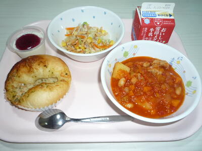 献立: 黒糖パン、牛乳、なすのミートグラタン、鶏肉とコーンのスープ、フルーツポンチ