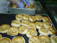 今日は、歯と口の健康週間3日目の給食で、カルシウムを多く含むチーズを提供しました。チーズは、ハンバーグと一緒にパンにはさんでいただきました。ハンバーグは、調理員さんが1個ずつソースにからめてから、配缶をしてくれました。