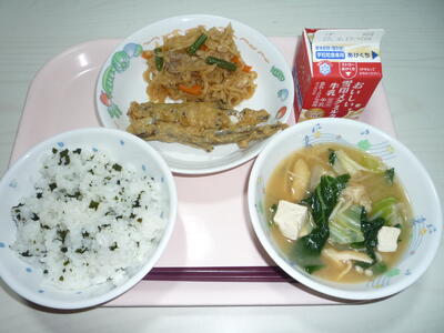 献立: わかめご飯、牛乳、ししゃものごま揚げ、切干大根の炒め煮、みそ汁