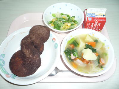 献立: ココア揚げパン、牛乳、アスパラとキャベツのサラダ、ポトフ