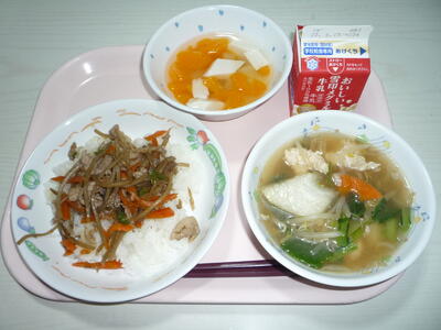 献立: ご飯、牛乳、きんぴらごぼう、冬瓜と肉団子のスープ、豆乳ゼリーとフルーツの和え物