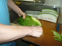 今日のきんぴらは、野田市のブランド「さくらポーク」で作りました。ご飯にのせて、いただきました。冬瓜は沖縄県産のもので、調理員さんが硬い皮をむき、食べやすい大きさにカットしてくれました。