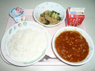 献立: ご飯、牛乳、ハッシュドポーク、こんにゃく海藻サラダ、ヨーグルト