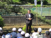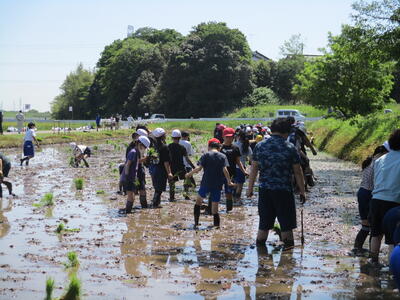 東部中学校1年生、東部小学校及び柳沢小学校5年生と合同で田植え体験活動を実施しました。野田市長を始め、多くの地域の方々に応援いただき、素晴らしい天気の中、精一杯田植えを行うことができました。中学生は小学校5年生の時に一度経験をしています。そのため、今回は先輩として初めて参加する小学生の中に交ざって指示を出したり誘導したりと、リーダーシップをとる勉強を含めた活動でした。大変多くのことを学んだ一日となりました。