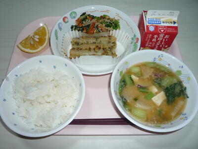 献立: 発芽玄米ご飯、牛乳、鯖のソース煮、いそか和え、豚汁、甘夏