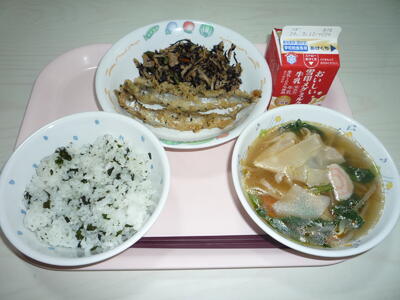 献立: たけのこご飯、牛乳、千草焼き、小松菜のおひたし、けんちん汁、ヨーグルト