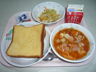 献立: フレンチトースト、牛乳、イタリアンサラダ、ミネストローネ、味付小魚