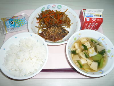 献立: ご飯、牛乳、鯵のごまみそ焼き、きんぴらごぼう、筍とかまぼこのすまし汁、かしわもち
