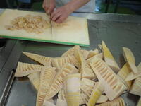 今日は、新物のたけのこで「たけのこご飯」を作りました。そこで給食時間に、「たけのこの成長」について話題にしました。今日は、米(黒酢米)・小松菜・卵が野田市産でした。