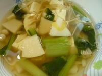 かきたま汁は、野田市産の卵と小松菜で作りました。今日は卵と小松菜の他に、米(黒酢米)・白味噌が野田市産でした。