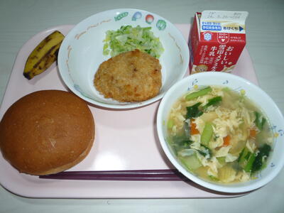 献立: セルフサンド(丸型コッペパン・じゃがいものコロッケ・ゆでキャベツ)・牛乳・たまごスープ・バナナ