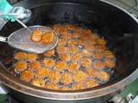 コロッケは、給食で作るのが大変なメニューの一つです。コロッケが出来上がるまでには、たくさんの工程があります。じゃがいもを蒸してつぶした後、玉ねぎやひき肉などの具材と混ぜて、小判型に形を整え、衣をつけて油で揚げます。揚げるのも大変で、調理員さんが油の温度をこまめに確認をしながら、揚げてくれました。今日は、米(江川米)・小松菜・人参・白菜が野田市産でした。