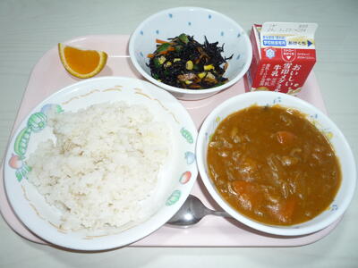 献立: 麦入りご飯、牛乳、◆東中チキンカレー、◆ひじきのサラダ、スイートスプリング(◆3年生からのリクエストです)