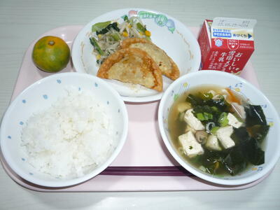 献立: ご飯、牛乳、揚げ餃子、もやしのソテー、わかめスープ、みかん