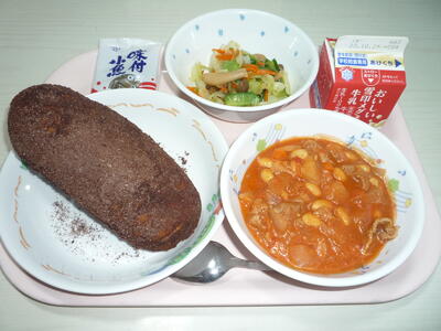 献立: ココア揚げパン、牛乳、キャベツとしめじのサラダ、ポークビーンズ、小魚