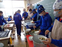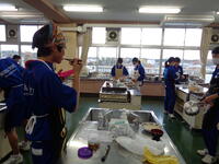 新型コロナウイルスの感染者が増加傾向にある中、東部中学校では各クラスに空間除菌薬を設置しました。また、教室の人数を半分(交代実施)に減らし、器具も一人一つずつ使用し調理実習を行いしました。献立は、生姜焼きとスープでしたが、笑顔で食べる姿が印象的でした。