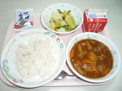 献立: 麦入りご飯、牛乳、東中チキンカレー、パイナップルサラダ、味付小魚