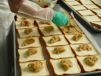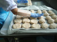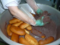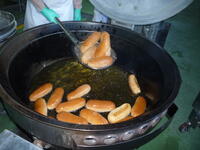 今日のポークビーンズは、千葉県産の大豆で作りました。ポークビーンズに入れた野菜は、大豆に合わせて小さめの角切りにカットしました。揚げパンは、コッペパンを揚げた後、一個ずつ丁寧にココアパウダーをまぶしました。