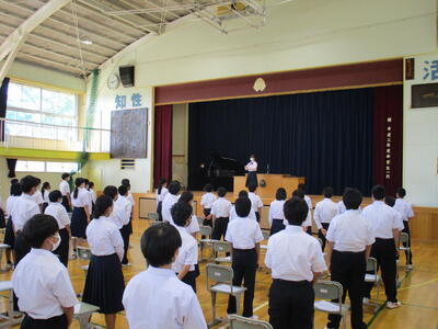 また、校長先生や安全主任、生徒指導主任の先生から夏休み中の生活について話がありました。残念ながら、毎年夏休み中は、中学生の交通事故、水の事故が必ず起こっています。我々学校からの願いは「8月21日の登校日、9月1日の開始日に『全員が元気に登校してくれること』」です。何より生徒たちに伝えたかったことです。しおりを使って夏休み数週間前から生徒たちとよく考える時間を持ってきました。是非、ご家庭でも生徒たちと話題にしていただき、充実した夏休みにしてください。