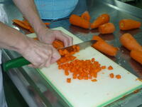 給食では、ほぼ毎日登場する人参。今日はサラダとポークビーンズに使いましたが、サラダは千切り、ポークビーンズは角切り、と同じ食材でも料理によって切り方を変えています。また、じゃがいもは、一つずつ芽を取ります。毎日暑い中、調理員さんたちは衛生面はもちろん、生徒たちが美味しく、安全安心な給食が食べられるよう、いろいろな工夫をしてくれています。