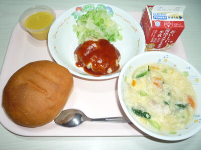 献立: 丸型コッペパン、牛乳、おからハンバーグ、ゆでキャベツ、ふわふわ卵スープ、かぼちゃプリン
