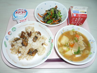 献立: さんまご飯、牛乳、いそ和え、豚汁、ヨーグルト