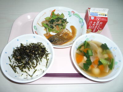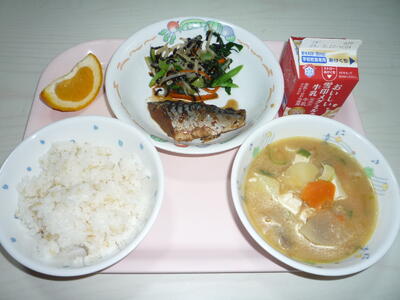 献立: 発芽玄米ご飯、牛乳、鯖のソース煮、いそか和え、豚汁、甘夏