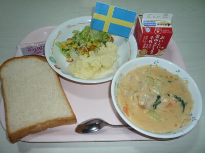 今日は、「旅する昼ご飯」でスウェーデンの料理を給食用にアレンジして提供しました。「ショットブラール」はスウェーデンを代表する家庭料理です。スパイスを効かせたしっかり味のミートボールにブラウンソースをかけ、コケモモの一種である「リンゴンベリー」のジャムをつけて食べるのが特徴だそうです。そこで、給食時間に各教室で「パンにつける用に、いちごジャムを提供しました。ジャムとミートボールの本場の味が気になる人は、一緒に食べてみてね。」と声をかけました。またスウェーデンでは、ミートボールにはマッシュポテトを添えるのも定番だそうです。