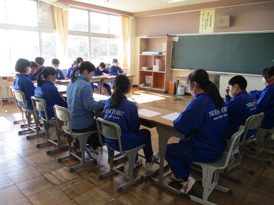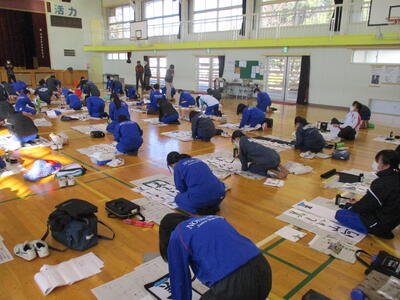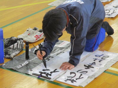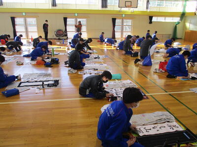 1月9日に1,2年生は席書大会を行いました。講師の方を迎え、静かな中に、迫力を感じさせる緊張感のある席書大会となりました。講師の先生からも「上手な生徒が多い」と評価をもらうほど、皆素晴らしい作品を仕上げました。先生に教わったことを一文字ずつ何度も繰り返し書いて練習する様子や、自分で納得がいかない箇所を見つけ改善をしようと努力する姿があたりまえのように見られる、今の東部中の良いところがたくさん見られました。